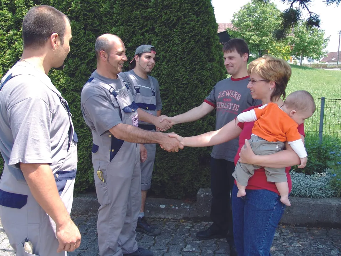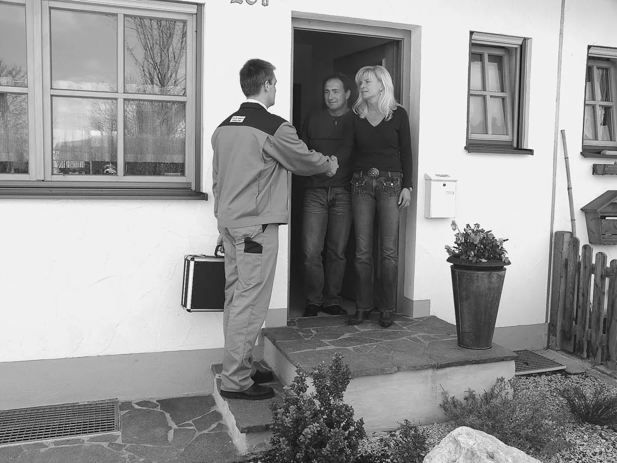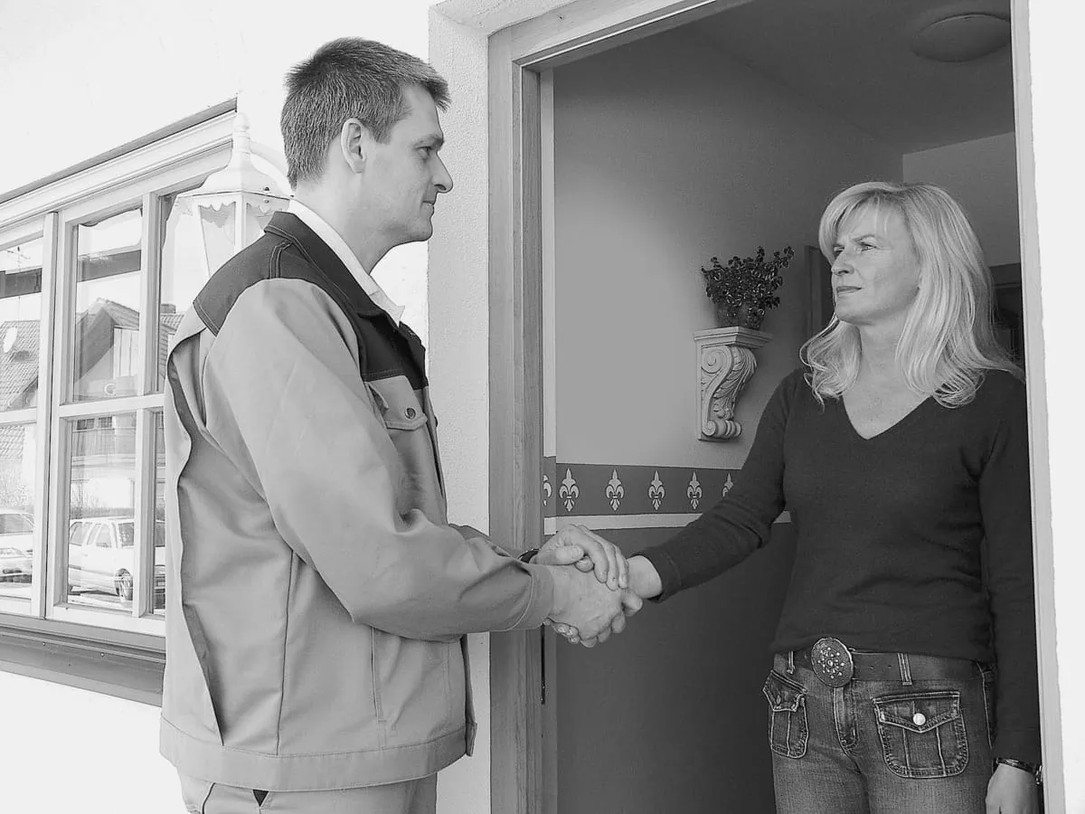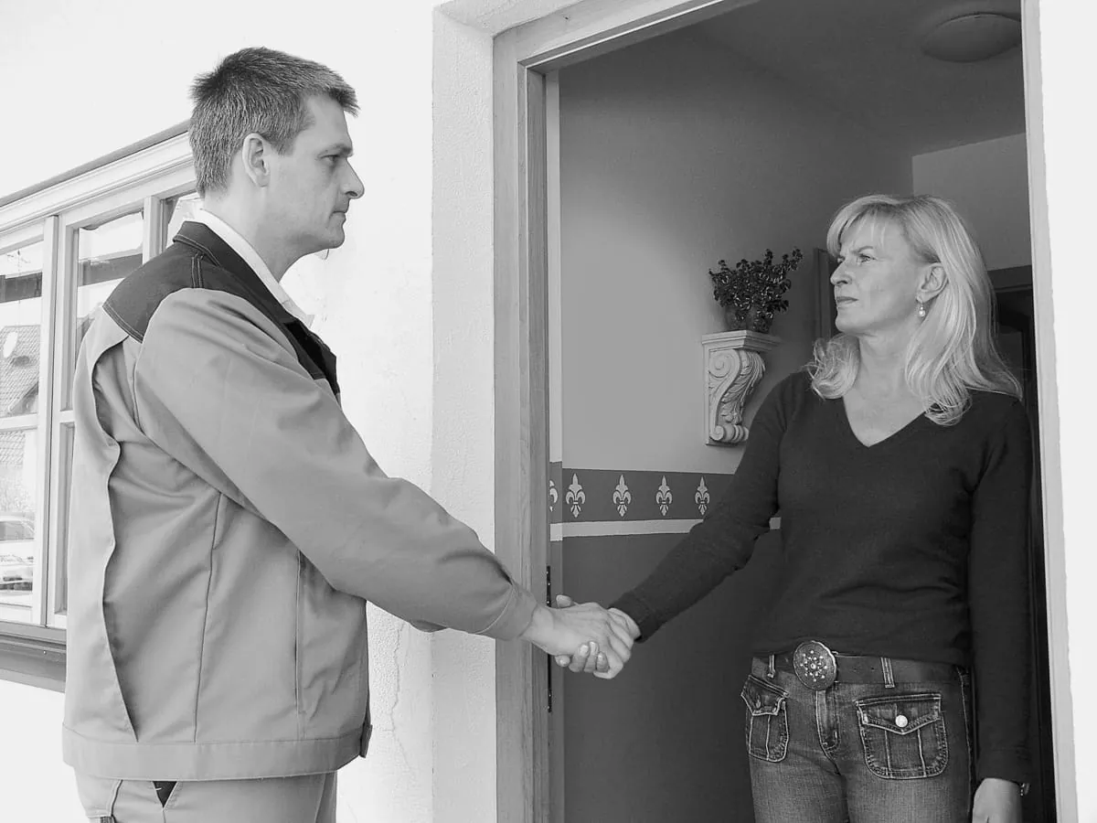 Falsch: Den Kunden durch mangelnde Distanz bedrängen, ihm den Vortritt ins Haus nehmen. Der Handwerker wird so als Eindringling empfunden.