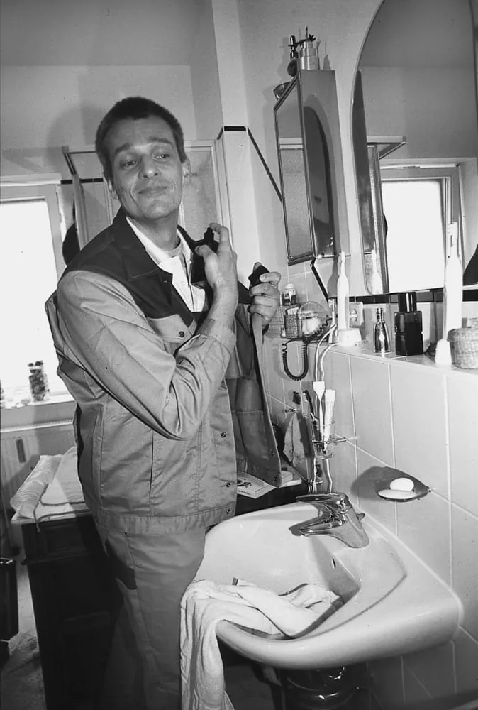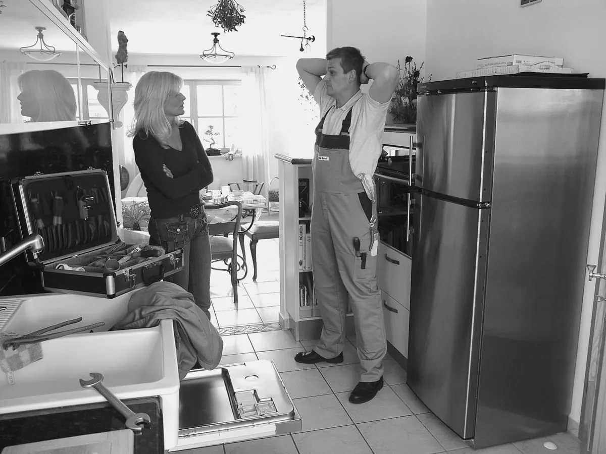 Als Handwerker dem Kunden mit unfreundlicher Mimik, mürrischen, abweisendem Gesichtsausdruck, ohne Lächeln gegenüberstehen