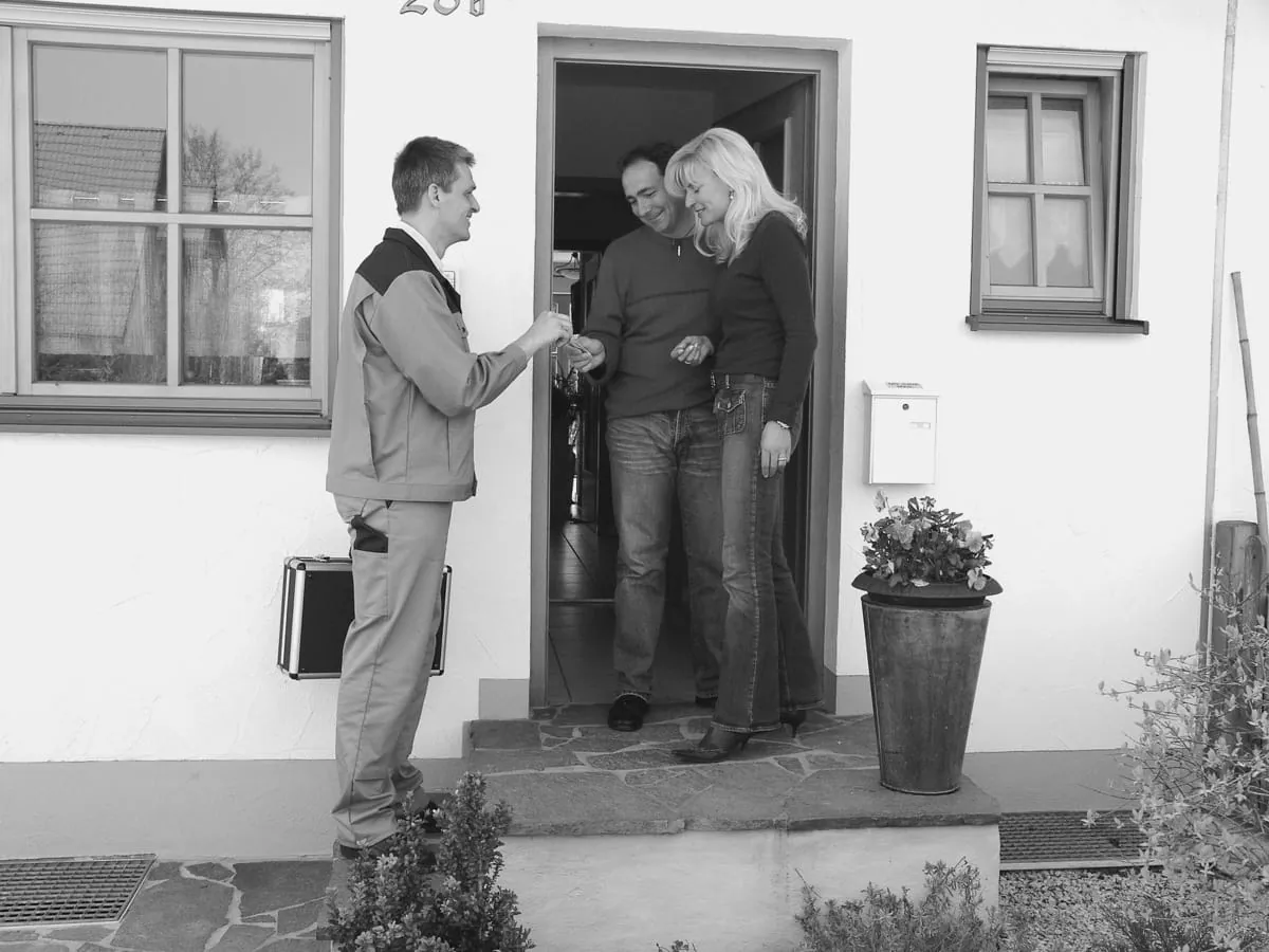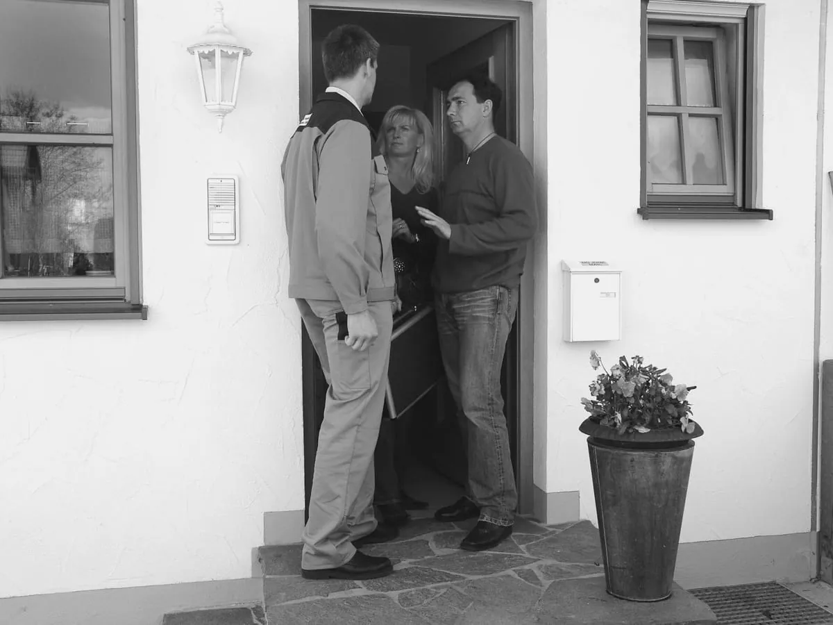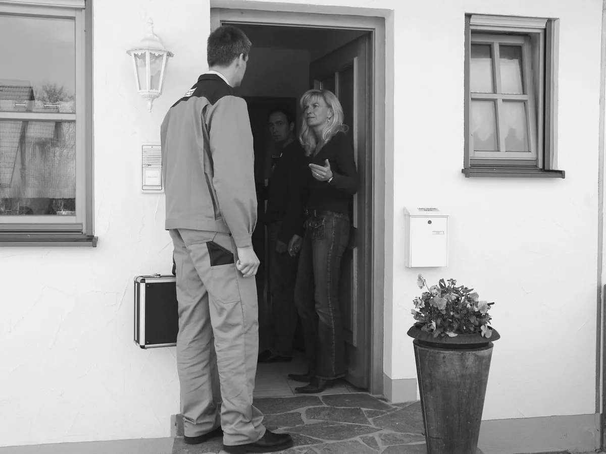 Erste Stufe der Annäherung: Nach dem Klingeln bleibt der Handwerker in einer höflichen Distanzzone und lässt die Kunden erst aus ihrem Haus kommen.