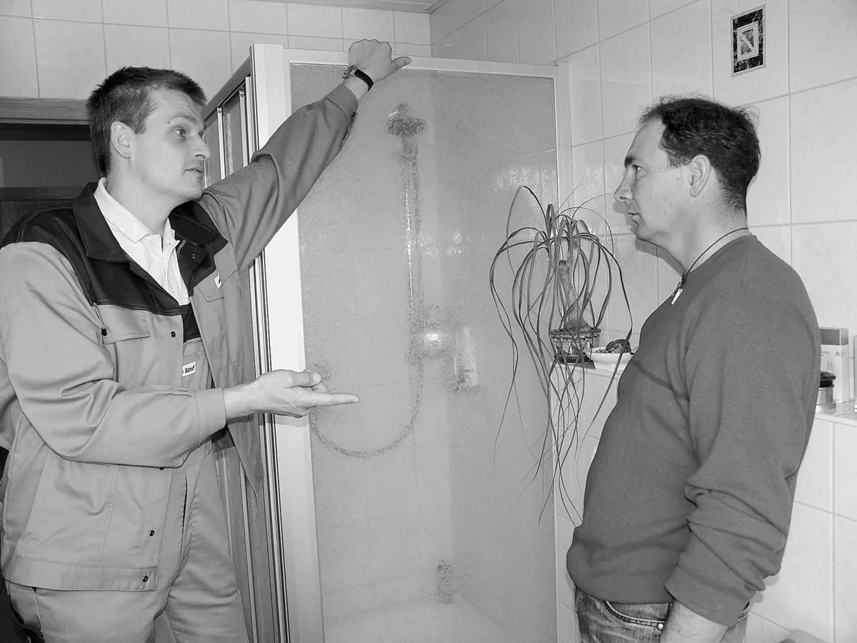 Das Einnehmen von Kundeneigentum wie Türpfosten, Möbeln und wie hier Duschkabinen wird als Übergriff in die Privatsphäre gewertet.
