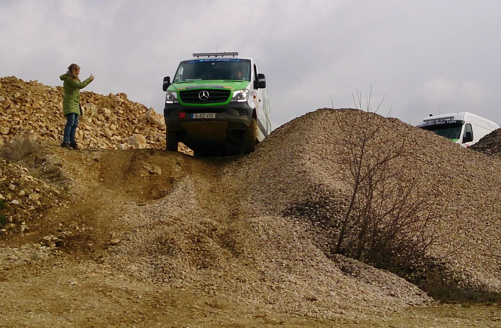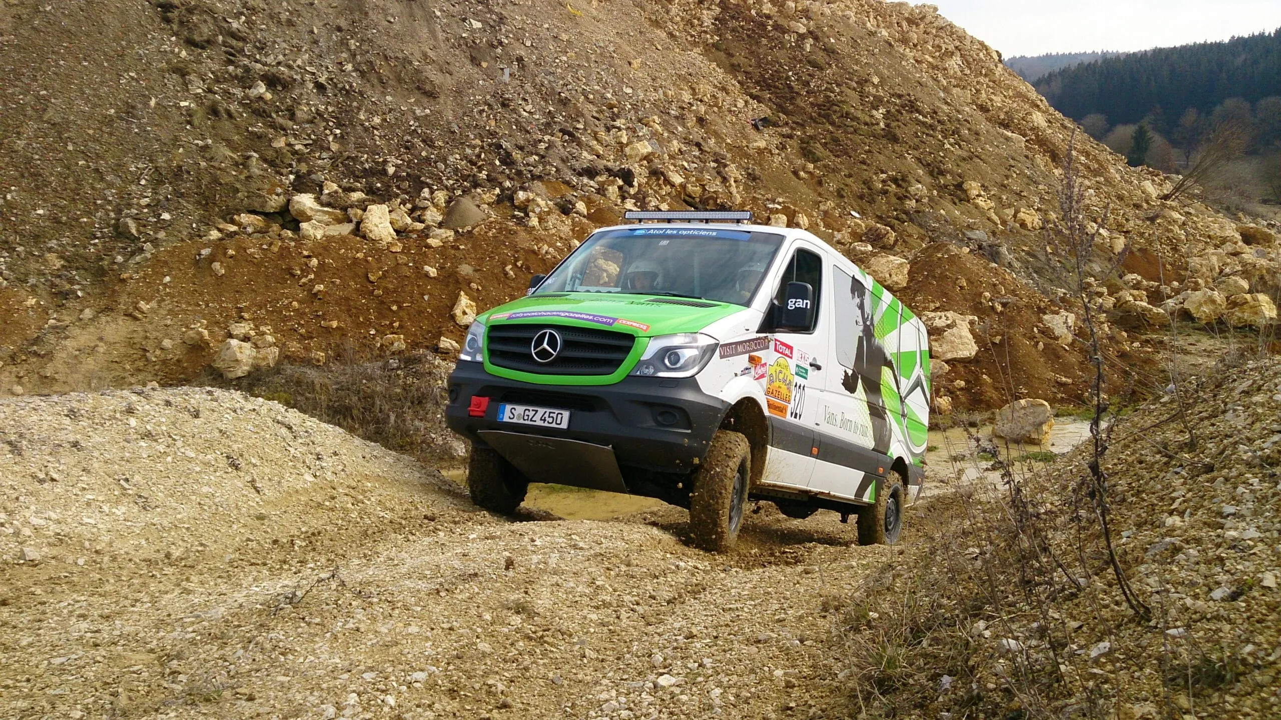 Das Rallye-Fahrzeug, ein nagelneuer Mercedes Sprinter, konnten die beiden Handwerkerinnen in einem Offroad-Parcours in Merklingen bei Stuttgart ausgiebig testen. „Ich war erstaunt über das gute Handling des Fahrzeugs. Der Transporter ist ja schon riesig, lässt sich aber trotzdem gut fahren“, sagte Bianca Mühlhammer nach dem Training am 4. März.