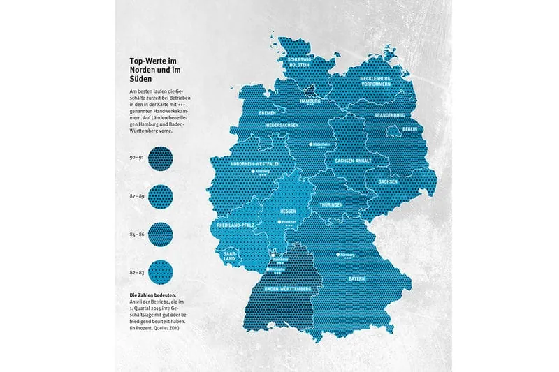 Interessant ist hier, dass es selbst innerhalb der Bundesländer noch Unterschiede bei der Geschäftslage gibt – ein Indiz, dass die Region für den Handwerksbetrieb immer noch entscheidend ist. So hat zum Beispiel die Handwerkskammer Braunschweig-Lüneburg-Stade für ihre Mitgliedsbetriebe einen Geschäftsklimaindex von 62 Punkten ermittelt, sechs Punkte unter dem Vorjahresniveau. Die Handwerkskammer Osnabrück-Emsland-Grafschaft Bent–heim gibt einen Geschäftsklimaindex von 89 Punkten an, ein Punkt mehr als der Vorjahreswert. In Baden-Württemberg spricht die Handwerkskammer Heilbronn-Franken von einem verhaltenen Start ins Jahr 2015, die Kammer Karlsruhe meldet für das erste Quartal einen höheren Konjunkturindikator als im Vorjahr.