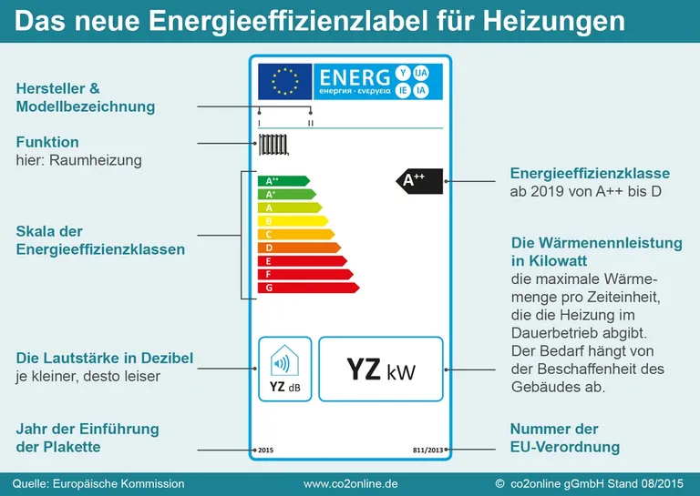Von Kühlschränken und Glühbirnen ist es schon bekannt, ab dem 26. September 2015 finden es sich auch auf neuen Heizungen und Warmwasserbereitern: Das Energielabel der Europäischen Kommission. Das Label soll die Kaufentscheidung für klimafreundliche Heizkessel erleichtern und die Industrie motivieren, energieeffizientere Geräte herzustellen. Das in Ampelfarben gestaltete Heizungslabel ordnet der Heizung eine Effizienzklasse von A++ (sehr effizient) bis G (ineffizient) zu, welche mit einer Farbe auf der Farbskala Grün (A++) bis Rot (G) gepaart ist. 2019 wird die Bewertungsskala dann auf A+++ bis D angehoben.