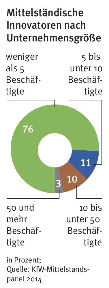 Wenn die Kapitalbeschaffung für eine Innovation so reibungslos läuft wie bei der Schreinerei, ist das allerdings eher die Ausnahme als die Regel. Häufig haben es Handwerksunternehmer schwer, die Bank zu überzeugen. Deshalb kommt es ihnen gut zupass, wenn Bund und Länder die Firma bei der Finanzierung unterstützen. Dazu laufen zahlreiche Programme für die Entwicklung und Markteinführung der Innovationen. Der Staat will den Mittelstand animieren, in den Fortschritt zu investieren. „Innovationen sind in unserer Wirtschaftswelt der Schlüssel zum Erfolg“, sagt Iris Gleicke, Parlamentarische Staatssekretärin beim Bundeswirtschaftsministerium. So arbeiten 76 Prozent der mittelständischen Innovatoren in Deutschland mit weniger als 5 Mitarbeitern, 10 Prozent haben zwischen 10 und 50 Beschäftigten (siehe Grafik). Die Staatsbank KfW vergab im vergangenen Jahr aus dem ERP-Innovationsprogramm Kredite in Höhe von über 1,3 Milliarden Euro. Jan-Christopher Breuel, Experte für Förderfinanzierungen bei der Hamburger Sparkasse (Haspa), nennt einen großen Pluspunkt der Förderungen: „Die Darlehenskonditionen liegen im Schnitt etwa ein Prozent unter dem Marktzins. Das ist enorm günstig“. Dabei beginnt die Förderung nicht erst bei der Darlehensaufnahme für ein innovatives Projekt. Der Staat gewährt auch Zuschüsse für eine Erstberatung durch einen externen Experten (siehe „Das Projekt mit Zuschuss und Darlehen realisieren“). Die Palette der Förderchancen ist groß. Deshalb sollten sich Firmenchefs frühzeitig über ihre Möglichkeiten informieren.