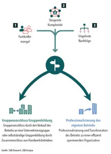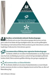 Grundsätzlich sind hier drei Szenarien denkbar: Der Betrieb wird von einer national tätigen Unternehmensgruppe übernommen und integriert, wodurch der Inhaber die Eigenständigkeit verliert, aber auch die größtmögliche Unterstützung in der kontinuierlichen Professionalisierung des Unternehmens erhält. Durch den Anschluss an eine Gruppe sind der Fortbestand des Unternehmens und die Nachfolge langfristig gesichert. Die zweite Möglichkeit ist die Bildung einer regionalen Handwerksgruppe, bei der sich einzelne Firmen mit anderen Handwerksbetrieben aus der Region durch einen Kauf oder eine Beteiligung zusammenschließen, wodurch die Eigenständigkeit größtenteils bestehen bleibt. Professionalisierungseffekte sind hier allerdings etwas geringer ausgeprägt als bei der nationalen Gruppe. Die einzelnen Betriebe haben meist jeweils eine besondere Stärke, zum Beispiel die Gewinnung von Mitarbeitern oder besonderes technisches Know-how, von dem dann die anderen Betriebe profitieren können. Die dritte und loseste Form der Gruppenbildung ist der Zusammenschluss zu einem Einkaufsbündnis. Bei dieser recht weit verbreiteten Form schließen sich Betriebe mit anderen Handwerksunternehmen zu einem Einkaufsbündnis zusammen, bei dem es neben einem Austausch unter den Betrieben vor allem um einen gesicherten Materialbezug zu attraktiven Konditionen geht.