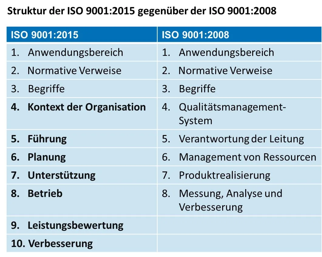 Die ISO 9001:2015 hat eine neue Struktur, genannt „High Level Structure“. Damit gibt es identische Strukturen für Managementsysteme und weitgehend einheitliche Kerntexte, Begriffe und Definitionen. So sollen andere Normen, wie die ISO 14001 für Umweltmanagement und die BS OHSAS 18001 für Arbeits- und Gesundheitsschutz nach der gleichen Struktur überarbeitet werden.