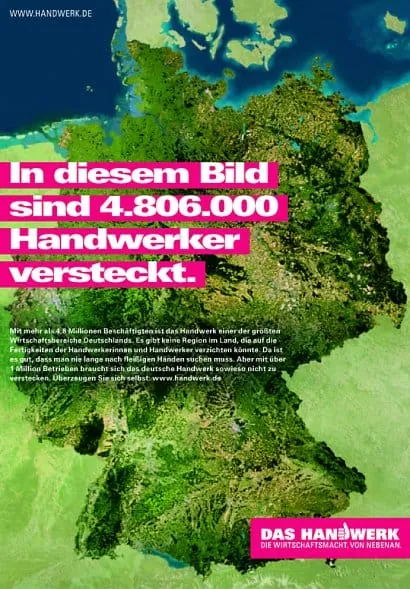 Das Motto der Kampagne „Die Wirtschaftsmacht. Von nebenan.“ wurde mit mehr als 38000 Plakaten sowie zahlreichen Anzeigenschaltungen ins Land getragen. Mit über 1100 Ausstrahlungen im Fernsehen hat der Kampagnen-Spot rund 32 Millionen Zuschauer erreicht. Eine weitere Million vorwiegend jüngerer Menschen sah den Handwerks-Spot im Kino, und mit über 900000 Besuchern fand die Kampagnenwebsite www.handwerk.de regen Zulauf. Auch Betriebe nutzen die Möglichkeit, sich als Teil der „Wirtschaftsmacht. Von nebenan” zu präsentieren. So wurden 600000 Aufkleber, 28500 T-Shirts und 6,3 Millionen Briefumschläge mit dem Kampagnenlogo geordert. Die Imagekampagne des deutschen Handwerks wird 2011 fortgesetzt. - rm