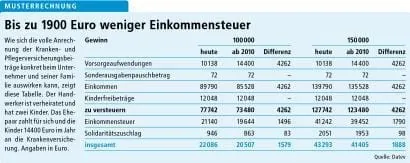 Der Vorteil: Alle gesetzlich und privat Kranken- und Pflege-Pflichtversicherten werden dann steuerlich gleich behandelt. Das gilt auch für die Ehepartner und mitversicherten Kinder. Bisher sind Beiträge für eine Kranken- und Pflegeversicherung nur in eingeschränktem Umfang steuerlich abziehbar.