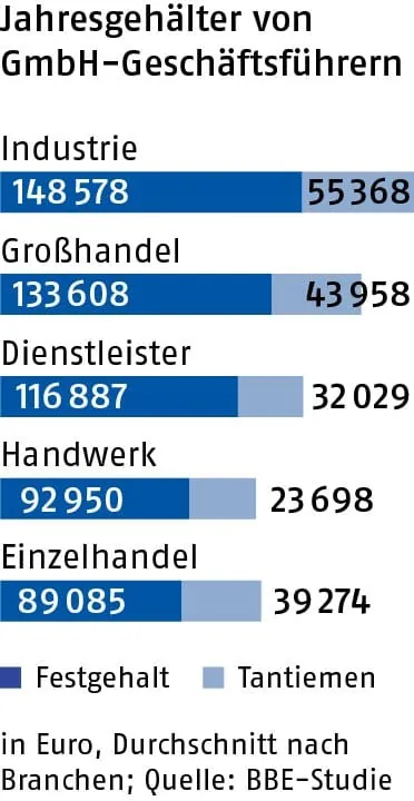 Die Prüfer stützen sich bei der Bewertung der Gehaltshöhe zumeist auf die Vergütungsstudien des BBE-Media-Verlags. Die aktuellen Daten für das Jahr 2011 liegen seit kurzem vor (siehe Tabelle). Sie zeigen: Die Festgehälter der Geschäftsführer sind im Vergleich zum Vorjahr fast flächendeckend gestiegen. Im Handwerk insgesamt, so die Studie, beziehen die GmbH-Geschäftsführer im Schnitt ein Festgehalt von inzwischen knapp 93000 Euro - rund 6000 Euro mehr als 2010. Lediglich im Baunebengewerbe und in Druckereien sind die durchschnittlichen Jahreseinkünfte von GmbH-Geschäftsführern im Jahr 2011 niedriger als im Vorjahr. Im Vergleich der Wirtschaftszweige hält die Branche dennoch fast die rote Laterne, knapp vor dem Einzelhandel mit 89085 Euro und deutlich hinter der Industrie (siehe Grafik rechts).
