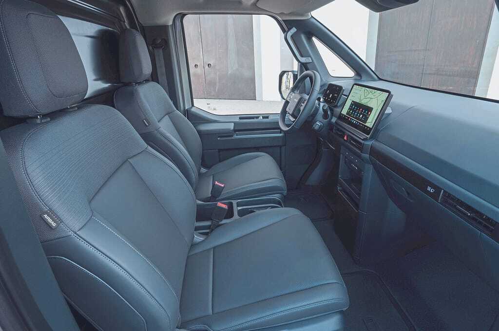 Auffallend ist das sanftmütige Fahrverhalten. Die Vorderachse mit ungewohnten Doppelquerlenkern – das passt, weil die E-Antriebseinheit wenig Platz benötigt – bügelt Fahrbahnunebenheiten ebenso glatt wie die schraubengefederte Verbundlenker-Hinterachse. Dazu ist der Transporter mit 11,7 Metern Wendekreis recht handlich. Angenehm: An Bord herrscht Ruhe. Dank des leisen E-Antriebs, geringer Fahrwerksgeräusche und Akustikverglasung der Türscheiben.