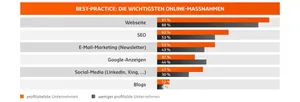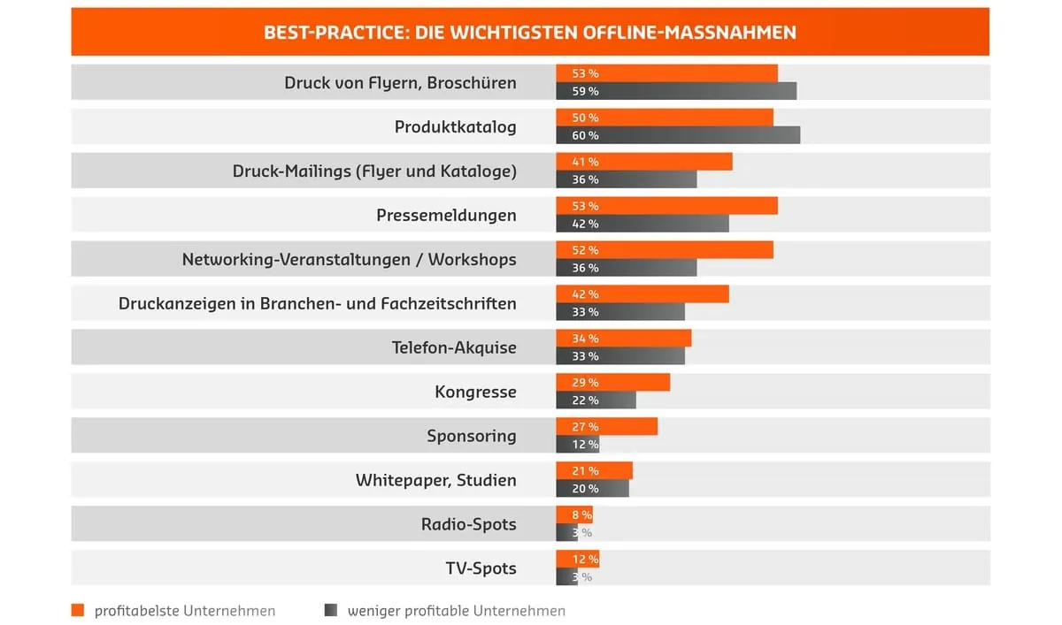 So sind die klassischen Druckprodukte für größere Unternehmen deutlich wichtiger als für kleine mittelständische Unternehmen. Bei den Best-Practice-Unternehmen lässt sich darüber hinaus ein Trend zur Pressearbeit und Networking-Events erkennen.