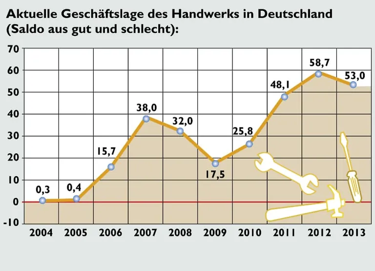 Mit 10,4 Prozent erwartet hingegen jeder zehnte Betrieb zurückgehende Umsätze. Eine stabile Umsatzentwicklung sehen die Analysten von Creditreform im Bauhauptgewerbe, im Ausbauhandwerk und dem Metallhandwerk.