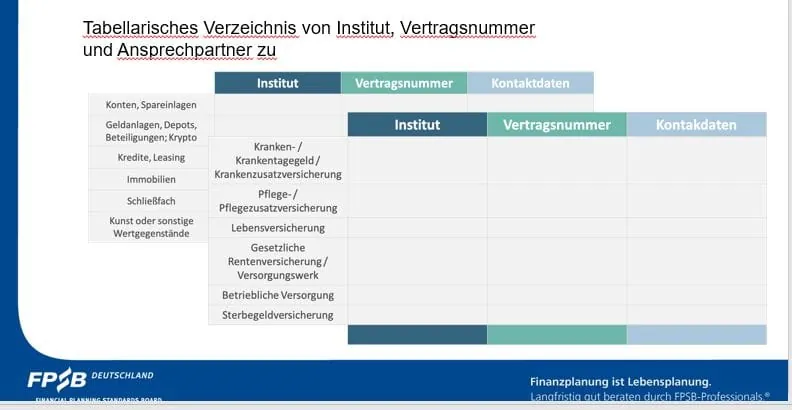 Den Überblick in fremden Versicherungsunterlagen zu bekommen, ist oft eine Herausforderung. "Hier hilft ein tabellarisches Verzeichnis von Institut, Vertragsnummer und Ansprechpartner", so Deike.
