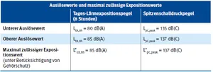 LärmschutztabelleAuslösewerte und maximal zulässige Expositionswerte nach der Lärm- und Vibrations-Arbeitsschutzverordnung
