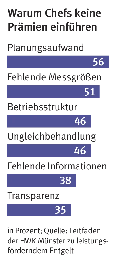 Im Jahr 2004, als bei Steffen die Leo-Gewinnbeteiligung eingeführt wurde, gab es nur in etwa zehn Prozent der Handwerksunternehmen flexible Vergütungen, wie eine Befragung der Fachhochschule Münster belegt. „In der Industrie war dieser Anteil schon damals etwa dreimal höher“, gibt der Autor der Studie, Thomas Jansen, zu bedenken. Und an diesem Abstand hat sich nach Einschätzung des Professors bis heute wenig verändert. Dass dies in der Praxis so selten umgesetzt wird, liegt nach eigener Einschätzung der befragten Unternehmer vor allem an zu großem Planungsaufwand, fehlenden Messgrößen und der Angst vor Ungleichbehandlung.