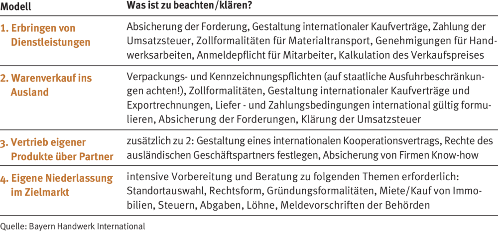 Es muss ja nicht gleich die eigene Niederlassung sein: Von der Dienstleistungserbringung über die Warenlieferung bis hin zur eigenen Filiale vor Ort gibt es viele Möglichkeiten, neue Absatzmärkte im Ausland zu erschließen. Die Tabelle zeigt die wichtigsten Geschäftsmodelle im Überblick.
