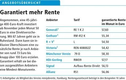 Aber für welche Mini- und Midijobber eignet sich die Betriebsrente? „Entscheidend ist, dass der geringfügig Beschäftigte seine Arbeitgeber nicht in sehr kurzen Zeitabständen wechselt. Für Studenten zum Beispiel bietet sich der Abschluss einer Betriebsrente in dieser Form nicht an“, erklärt Experte Stiefermann. Anders liegt der Fall, wenn der geringfügig Beschäftigte über mehrere Jahre seiner Tätigkeit im Unternehmen nachgeht wie bei Friseurmeister Ritter. Für den Chef ist die bAV mit bürokratischem Aufwand verbunden. Denn die betriebliche Altersvorsorge bietet dem Arbeitgeber verschiedene Wahlmöglichkeiten. „Je nach Situation des Arbeitnehmers kann eine Versorgung über eine Direktversicherung oder über eine Unterstützungskasse angefordert werden. Es handelt sich dann um eine vom Arbeitgeber oder über Entgeltumwandlung vom Arbeitnehmer finanzierte, beitragsorientierte Versorgungszusage“, erklärt Wolfgang Sachse, Vorstandsvorsitzender der Versorgungseinrichtung für Beschäftigte mit geringem Einkommen e.V. Minijobrente in Würzburg. Sachse gründete den Verein im April vergangenen Jahres. Arbeitgeber können kostenlos Mitglied werden und ihren Mitarbeitern über die „Versorgungseinrichtung Minijobrente“ eine betriebliche Altersversorgung bieten. Der Verein hat mit fünf Versicherungen dazu Rahmenverträge abgeschlossen (siehe Übersicht unten). In der Regel schließen die Minijobber eine Direktversicherung ab. Große Versicherungsgesellschaften bieten diesen Weg häufig an, und zwar entweder in der klassischen Variante mit einem garantierten Mindestzins von 2,25 Prozent oder als eine fondsgebundene Direktversicherung.