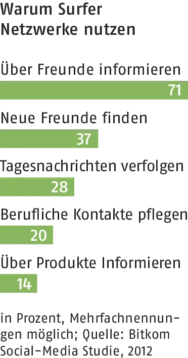Die Berliner Social-Media-Expertin Sandra Holze empfiehlt Unternehmern, „zunächst nur auf einem, höchstens zwei Netzwerken zu starten, Erfahrungen zu sammeln und die Aktivitäten dann auszudehnen“. Denn obwohl die Nutzung der Netzwerke (siehe Tabelle unten) überwiegend kostenfrei sei, dürfe der Aufwand nicht unterschätzt werden. „Social Networking verlangt, kontinuierlich am Ball zu sein, nicht nur, wenn gerade Zeit ist.“ Das Geheimnis der zielgenauen Verbreitung von Informationen liegt im Funktionsprinzip: Während man bei Suchmaschinen wie Google, Yahoo und Co. nur findet, wonach man aktiv sucht, versorgen soziale Netzwerke ihre Mitglieder (fast) ohne deren Zutun mit Informationen, die sie mit hoher Wahrscheinlichkeit interessieren. „Das zufällige Finden bekommt System“, nennt das Expertin Sandra Holze.