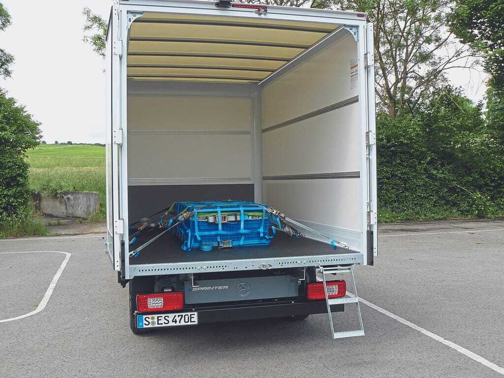 Extras aber heißen Kilos. Wobei der Junge-Koffer zu den Fliegengewichten zählt. Lightstar mit zusätzlichem Leichtbaupaket bedeutet Hilfsrahmen und Außenrahmen aus Aluminium, 14 Millimeter dünne Wände mit einer Wabenkonstruktion aus Polypropylen (PP) und ein PP-Boden mit rutsch­hemmendem Belag. Das Ergebnis: ein superleichter Raumriese mit lediglich rund 400 Kilo Gewicht. Das komplette Kampfgewicht liegt sogar minimal unterhalb des eSprinter als Kasten­wagen. Macht beim Testwagen gewogene 2,74 Tonnen, für Fahrer und Fracht bleiben lediglich 760 Kilo Luft.