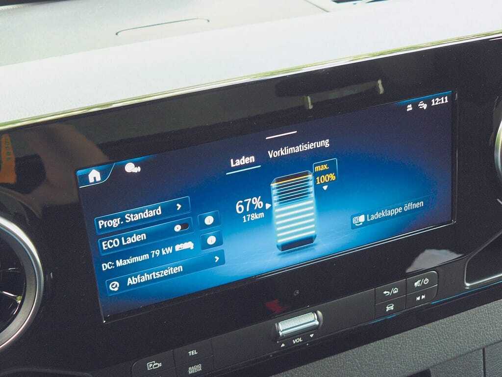 Im C-Modus und mit Standard-­Rekuperation absolvierte der Mercedes die anspruchsvolle, standardisierte Teststrecke beladen mit einem Schnitt von 32 kWh. Der vergleichbare Kastenwagen begnügte sich mit lediglich 25 kWh. Rund zehn Prozent beträgt der Zuschlag auf der Kurzstrecke. Er steigt im reinen Überlandeinsatz auf etwa 15 Prozent und bei gelassener Autobahnfahrt mit Tempo 100 auf gut 20 Prozent. Drüber geht die Schere auf: In beiden Fällen ist bei 120 km/h Schluss, aber in voller Fahrt schießt der Verbrauch des Koffers auf knapp 50 kWh empor. Ein Drittel mehr als beim Kasten. Klar, üppige Stirnfläche, zwischen den Achsen reichlich Angriffspunkte.