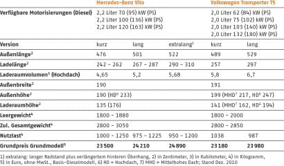 Der Volkswagen T5 und der Mercedes Vito sind die Spitzenmodelle bei den Transportern bis 2,8 Tonnen Gesamtgewicht. handwerk magazin hat den im Herbst 2010 neu vorgestellten Vito mit dem 2009 komplett überarbeiteten T5 verglichen. Hier die technischen Daten der Kontrahenten.