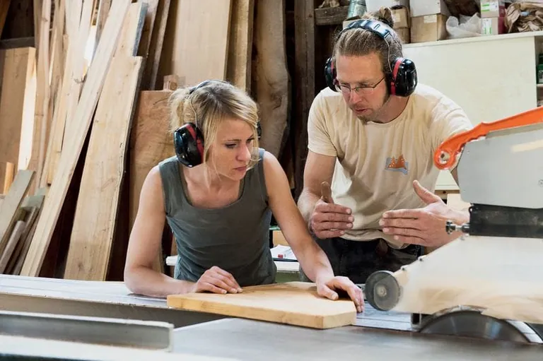 Zusammenarbeit: Tischlermeister Sascha Unger gibt Maike Bertram Tipps in der Werkstatt. - © Jens Nieth
