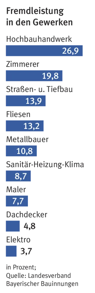 Vom Trend zum Komplettangebot profitieren somit auch klassische Handwerksbetriebe: Wer per Werkvertrag als Nachunternehmer für Komplettanbieter – Bauträger, Generalübernehmer oder Generalunternehmer – arbeitet, gewinnt Aufträge, die im Direktkontakt zu Bauherren nicht zu haben sind: vom schlüsselfertigen Einfamilienhausbau, über Gewerbe- und Industriebau bis hin zur Sanierung öffentlicher Gebäude. Leistungen von Handwerkskollegen einzukaufen gehört in einigen Gewerken mittlerweile sogar zum Tagesgeschäft. Nach einer Auswertung des Landesverbands Bayerischer Bauinnungen liegt der Fremdleistungsanteil etwa im Hochbauhandwerk bei knapp 27 Prozent.