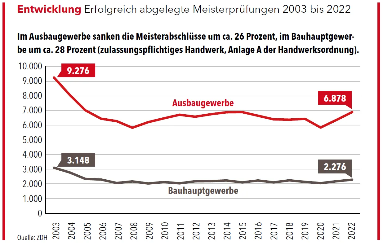 Insbesondere rückläufige Meisterprüfungen verschärfen die Situation. In den letzten 20 Jahren sank die Zahl der Meisterabschlüsse über alle zulassungspflichtigen Gewerke hinweg um 22 Prozent – im Ausbaugewerbe sank die Anzahl um fast 26 Prozent und im Bauhauptgewerbe sogar um fast 28 Prozent (siehe Grafik).