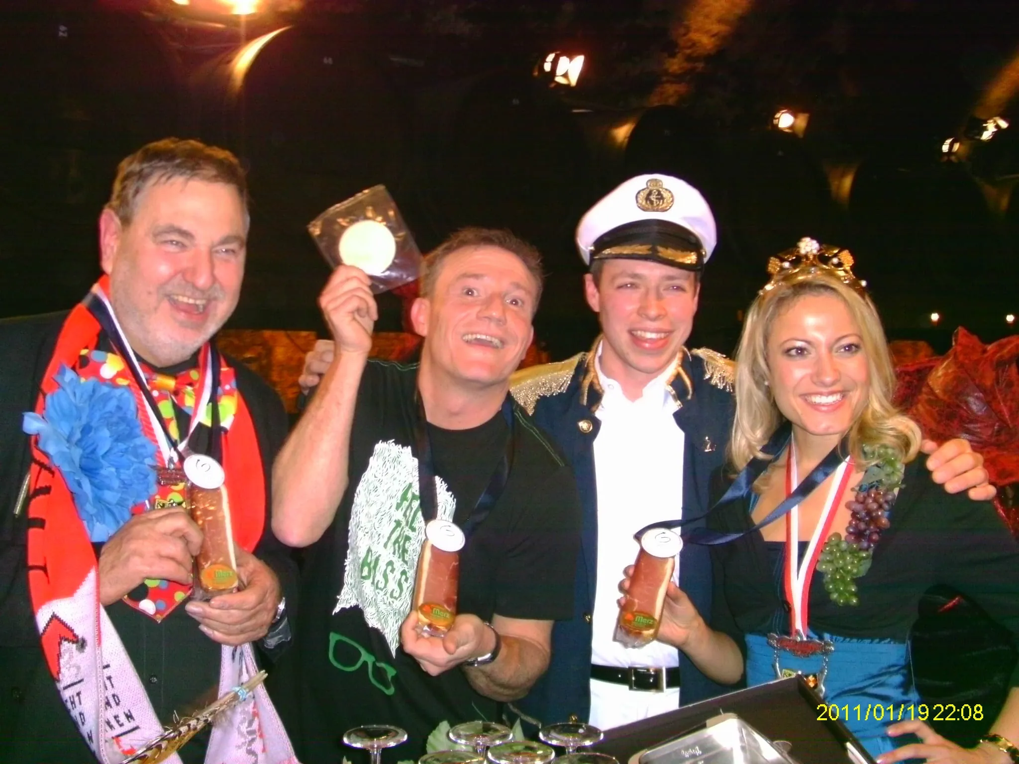 Würzburg/Hösbach. Jeder kennt sie aus dem Fernsehen, die wenigsten waren bisher dort. Gemeint ist die närrische Weinprobe des Fastnachtsverband Franken e.V. und des Bayerischen Rundfunks im Tiefen Keller der Residenz in Würzburg. Erstmals gab es bei den Aufzeichnungen im Staatlichen Hofkeller für den Präsidenten des FVF Bernhard Schlereth, für die Fränkische Weinkönigin Melanie Unsleber und für den, der die Gelbwurst neu erfunden hat, Michl Müller, den Schinken-Orden, den der einst aus Neuhütten stammende Bundesvorsitzende des Juniorenverband des Deutschen Fleischerhandwerks e.V. Jochen Merz anlässlich des 20-jährigen Bestehens überreichte.