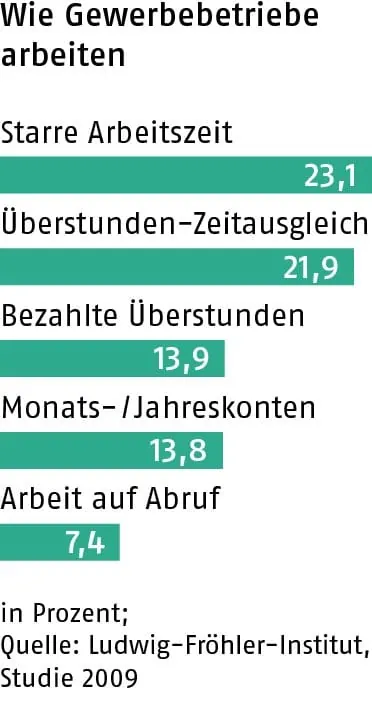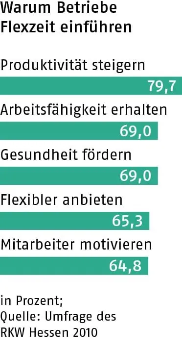 Trotz der eindeutigen Vorteile für Betrieb, Mitarbeiter und Kunden sind längst noch nicht alle Firmenchefs von der Einführung flexibler Arbeitszeiten überzeugt. Wie eine Umfrage des RKW Hessen im Rahmen des Modellprojekts „Arbeits-Zeit-Gewinn“ zeigt, haben 58 Prozent der befragten Betriebe kein Interesse an einer Veränderung der bestehenden Arbeitszeitregelung, nur 28 Prozent sind konkret an einer Arbeitszeitberatung interessiert.