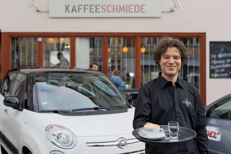 Frisch gerösteter Kaffee schmeckt immer noch am besten, deshalb wirft Tamas Fejer in seinem Ladenlokal täglich den Kaffeeröster an. Rund zehn Tonnen Bohnen verkauft er pro Jahr, 95 Prozent gehen über die Ladentheke, fünf Prozent trinken die Kunden in seinem Café. Fejer röstet den Kaffee 15 bis 20 Minuten, bei industriell hergestelltem Kaffee sind es nur rund drei Minuten. Die von Hand gerösteten Bohnen sind deutlich bekömmlicher, weil dabei viele Säuren abgebaut werden. Rund zehn Sorten hat er ständig im Angebot: wild gewachsenen Kaffee aus Äthiopien genauso wie besonders milden Maragogype aus Nicaragua. Auch wenn Fejer Kaffee brüht, nimmt er es damit ziemlich genau: Ein Espresso sollte rund 20 Sekunden brauchen, „dauert es länger, wird er zu bitter, geht es zu schnell, ist er noch zu sauer“. Trotz seiner Affinität zu südländisch angehauchter Kaffeekultur wird Fejer mit dem Fiat 500L nicht recht warm. Der Kofferraum des gestreckten Cinquecento schluckt zwar klaglos mehrere Kaffeesäcke, beim Fahren durch die Düsseldorfer Innenstadt will aber keine Freude aufkommen.