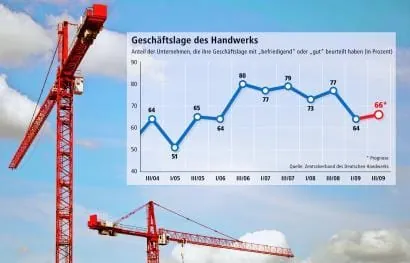 In Zeiten der Wirtschaftskrise sind sogar Konjunkturprognosen inflationär. Fast täglich gibt es neue Zahlen, und meistens verheißen sie nichts Gutes. Da überrascht das deutsche Handwerk, das einen Umsatzverlust von real rund zwei Prozent für das laufende Jahr erwartet. Das klingt nicht dramatisch, wenn man die Zahl vergleicht mit Prognosen aus anderen Wirtschaftsbereichen. So meldet das Statistische Bundesamt für das erste Vierteljahr 2009 einen Rückgang des Bruttoinlandsprodukts von 3,8 Prozent gegenüber dem vierten Quartal 2008. Im Frühjahrsgutachten der Forschungsinstitute wird für 2009 ein Rückgang des Bruttoinlandsprodukts um sechs Prozent prognostiziert. Kommt also das Handwerk mit einem blauen Auge aus der Krise?
