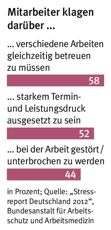 Trotz der Expertenwarnungen hat sich die Synchronarbeit längst in den Alltag eingeschlichen. Wie der „Stressreport Deutschland 2012“ der Bundesanstalt für Arbeitsschutz und Arbeitsmedizin zeigt, müssen bereits 58 Prozent aller Mitarbeiter verschiedenartige Aufgaben gleichzeitig betreuen (siehe Chart Seite 35). In Firmen, die eine Restrukturierung durchlaufen haben, sind es sogar 68 Prozent.