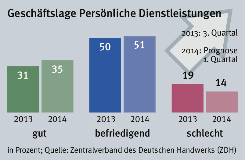 Fakten. Friseure, Schneider, Schuh- und Uhrmacher sowie die anderen persönlichen Dienstleistungsgewerke bleiben insgesamt zufrieden mit ihrer Geschäftsentwicklung: 81 Prozent vergeben das Urteil zufriedenstellend oder gut. Angesichts einer steigenden Anzahl von Erwerbstätigen, steigenden real verfügbaren Einkommen und hohen Arbeitsplatzsicherheiten sind die Konsumlaune und Anschaffungsneigung der privaten Verbraucher hoch.