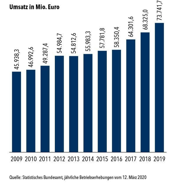 Nach überstandener Finanzkrise 2009 kennt der Umsatz in den Ausbaugewerken nur eine Richtung: nach oben! Das belegen die Ergebnisse der jährlichen Betriebserhebungen durch das Statistische Bundesamt in Wiesbaden. Obwohl die Zahlen für 2020 bis zum Redaktionsschluss leider noch nicht verfügbar waren, lässt der durch die Coronakrise zusätzlich befeuerte Trend zum Cocooning (darunter verstehen die Wissenschaftler den Rückzug der Kunden in die eigenen vier Wände) vermuten, dass der Wachstumskurs auch 2020 und 2021 – eventuell in einer leicht abgeschwächten Form – anhalten wird.