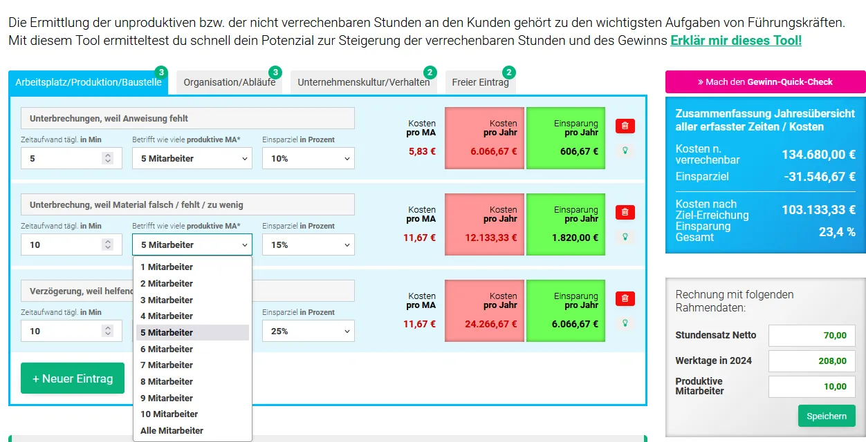 - Individualisieren Sie die Berechnungen mit Ihren Rahmendaten (Stundensatz netto und Anzahl der produktiven Mitarbeiter; mehr brauchen Sie nicht). Das Programm berechnet sofort die Kosten und stellt die mögliche Einsparung dagegen. Die Differenz bietet Ihnen eine Entscheidungsgrundlage für das weitere Vorgehen.