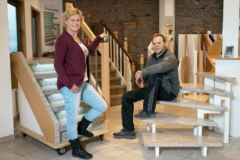 „Die Messe in Essen ist für uns eine Traditionsmesse, auf der wir hauptsächlich Altkunden treffen“, sagt Seniorchefin Marlies Friem, die im Familienbetrieb für Büro und Werbung verantwortlich ist. „Lieber sind uns im Grunde die kleineren Handwerksschauen, da die Leute hier gezielter zu uns kommen.“ Doch auch mit elf anderen Treppenbauern in einer Halle, wie auf der letztjährigen Mode Heim Handwerk, weiß der Betrieb, wie man das Publikum an den Stand zieht.