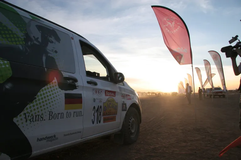 Viola Hermann und Vanessa Wagner fahren im Mercedes-Benz Vito ein beherztes Rennen in der Wüste von Marokko. Zur Halbzeit bei der Rallye Aïcha des Gazelles liegt das Handwerksteam in der Kategorie Crossover auf dem dritten Platz. Vor ihnen liegen noch zwei weitere Transporter von Mercedes-Benz.