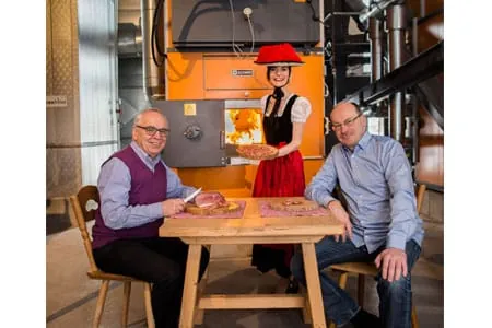 Metzgermeister Peter Adler (l.) mit solarcomplex-Vorstand Bene Müller an einem Tisch vor dem Holzhackschnitzel-Heizkessel des Schinken-Herstellers. »Wir versorgen mit unserer Anlage zusätzlich rund 120 Gebäude mit Wärme.« - © Adler, Bonndorf