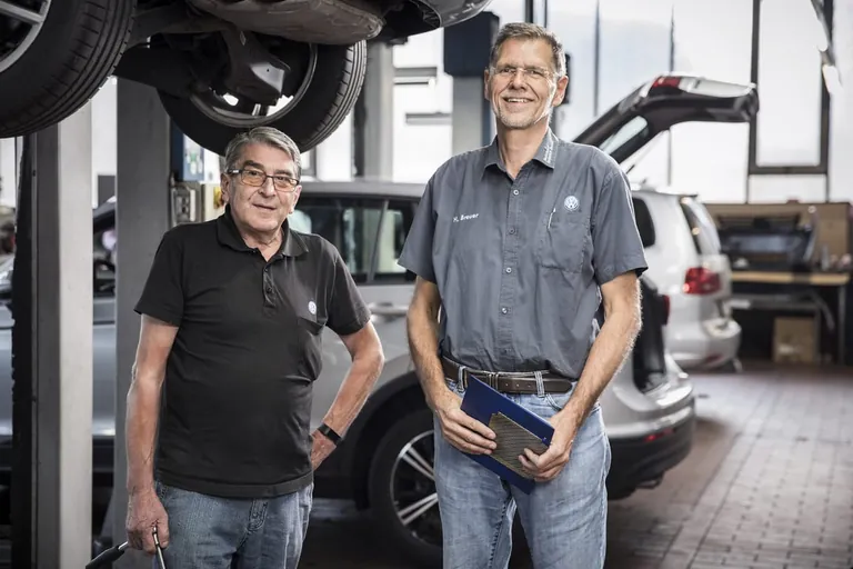 Unternehmer Heinz Breuer, Geschäftsführer des Autohauses Heinrich Breuer in Grevenbroich, beschäftigt Kfz-Mechaniker Dieter Hösen auch nach Eintritt in den Ruhestand weiter - © Markus J. Feger