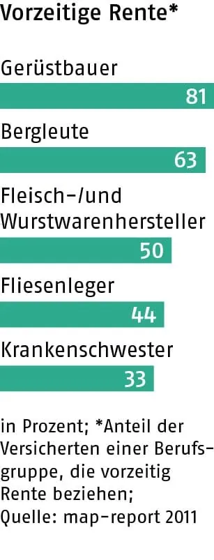Der 32-jährige Knape zahlt als Selbständiger in die gesetzliche Rentenversicherung ein, bis seine 18 Pflichtjahre erfüllt sind. Doch er weiß, vom sozialen Sicherungsnetz hätte er im schlimmsten Fall nichts zu erwarten. Für alle Handwerker ab Jahrgang 1961 und jünger wurde der gesetzliche Berufsunfähigkeitsschutz abgeschafft. Eine gesetzliche Frührente gibt es für Selbständige nur noch, wenn der Betroffene überhaupt nicht mehr oder nur noch wenige Stunden am Tag irgendeiner Tätigkeit nachgehen kann. Diese Erwerbsminderungsrente liegt bei durchschnittlichem Verdienst sowie 25 Versicherungsjahren zwischen 603 Euro und 680 Euro.