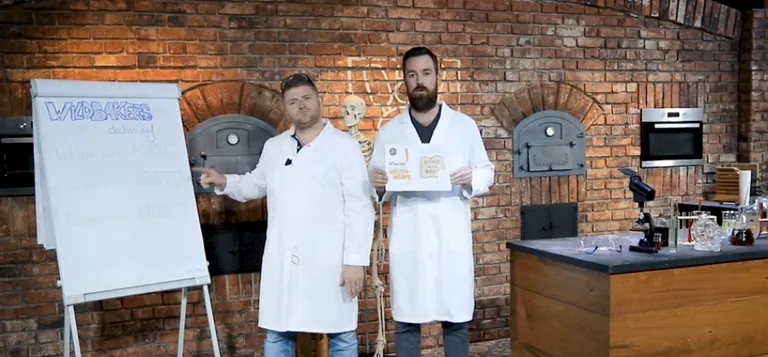 In einem knapp vierminütigen Youtube-Clip gehen die Wildbakers, gekleidet in weißer Laborkluft und ausgestattet mit diversen Reagenzgläschen sowie Pinzetten, dem Getreide-Mythos auf den Grund – mit einem erstaunlichen Ergebnis. Nach einer nicht unerheblichen Menge eingeflößtem Weizen-Bier müssen die beiden feststellen: Die Fachbuch-Autoren haben Recht! Wirken sie doch nach dem Test leicht dümmlich, sie beklagen Schwindel und Übelkeit und Schmids Bauch sei ein ganzes Stück gewachsen, stellt Hirth fest.