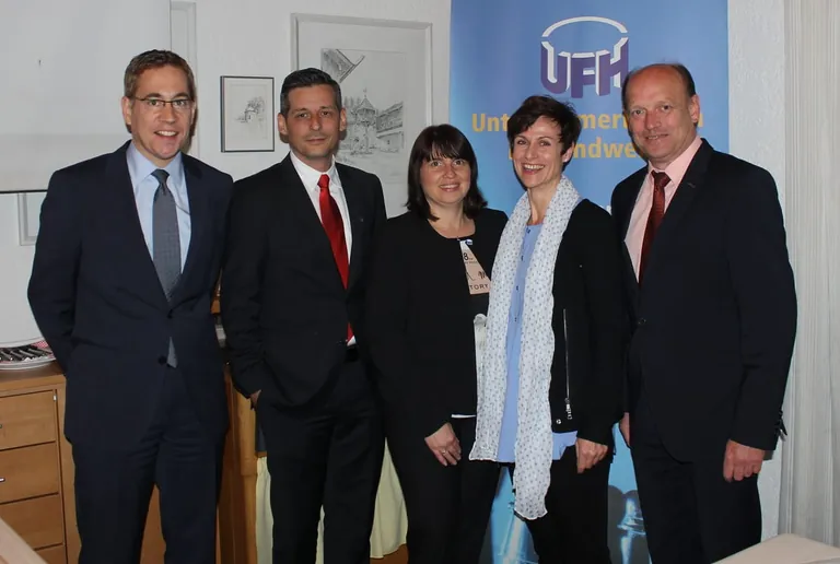 von links: Notar Christian Steer, Sparkasse-Versicherungsbeauftragter Meikel Fieseler, UFH-Vorsitzende Manuela Nemela, UFH-Vorstandsmitglied Doris Schandl, Hans-Peter Summer Leiter Sparkasse Piflas - © Barbara Ramsauerr/UFH Landshut