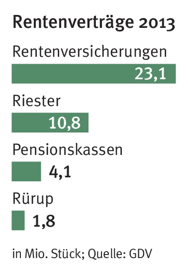 Sparer entdecken die Basisrente. Aktuell sind die Rürup-Verträge der Rentenversicherungszweig mit dem größten Absatzplus. Dies belegen Zahlen des Branchenverbandes GDV. Während 2013 die Anzahl der Verträge insgesamt um 2,1 Prozent auf 39,8 Millionen stieg, sprang die Anzahl der Basisrenten um 12,5 Prozent auf 1,8 Millionen. Das Wachstum erfolgt auf niedrigem Niveau, steht aber für einen längeren Aufholprozess. Hintergrund: Im Dauerzinstief gewinnen Steuervorteile an Bedeutung. Nach Berechnungen des Instituts für Vorsorge und Finanzplanung (IVFP) erzielt die Basisrente eine Rendite nach Steuern von vier Prozent. Für Kai Müller, Vorstand Maklervertrieb bei HDI, „kann hier keine Anlageform der Basisrente das Wasser reichen“.
