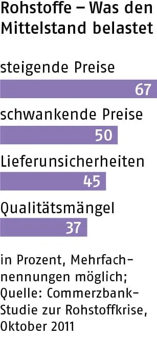Hinzu kommt laut Thiele noch ein weiteres Argument, das in Zeiten knapper und schwankender Rohstoffpreise immer mehr an Bedeutung gewinnt: „Die Betriebe können die gestiegenen Kosten oft gar nicht oder nur teilweise an die Kunden weitergeben.“ Wie sehr das Auf- und Ab an den Rohstoffmärkten die Unternehmer im Mittelstand belastet, zeigt eine aktuelle Studie der Commerzbank: 67 Prozent der befragten Firmenchefs klagen über steigende Rohstoffpreise, jedem Zweiten machen die massiven Schwankungen besonders zu schaffen (siehe Grafik Seite 31).