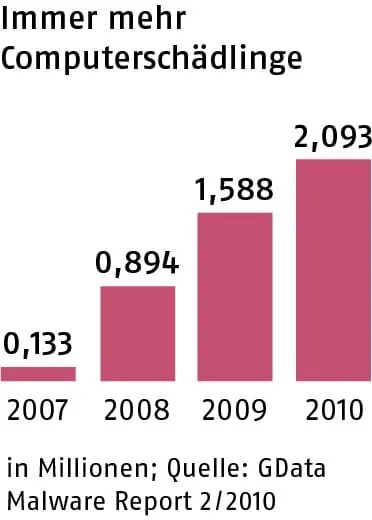 Allerdings sei ein wachsender Teil von Computerschädlingen auf die Mithilfe der PC-Nutzer gar nicht mehr angewiesen. „Sie werden einfach auf viel frequentierten - auch seriösen - Internetseiten versteckt“, so Wüest. Schon durch bloßes Anklicken der Seite könne der Schadcode auf Computer überspringen, die etwa durch nicht aktualisierte Virenscanner schlecht geschützt seien. „2010 entdeckten wir schließlich in jeder Stunde durchschnittlich über 30000 neue Bedrohungen“, gibt Wüest zu bedenken.