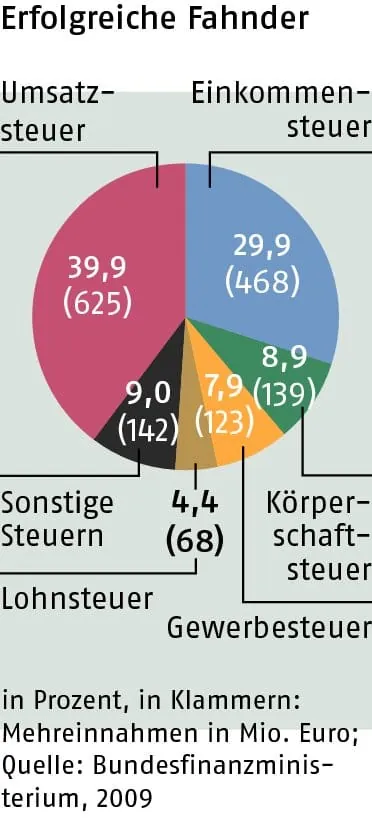 Fast 1,6 Milliarden Euro generierten die Steuerfahnder. Den größten Zuwachs gab es bei der Körperschaft- , Umsatz- und Gewerbesteuer.