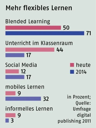 Der Unterricht im Klassenraum verliert in der betrieblichen Weiterbildung im mer mehr an Bedeutung. Wie eine Umfrage des Sprachenspezialisten digital publishing zeigt, setzen bereits heute 50 Prozent der Unterneh men auf einen Mix aus verschiedenen Lernfor men. Sogar 71 Prozent der Befragten gehen davon aus, dass Blended Learning - die Verknüpfung von E-learning, Präsenzveranstaltungen, Coaching und mobilen Lernfor men - in drei Jahren führend sein wird. Herkömmlicher Präsenzunterricht, heute im merhin noch von 44 Prozent der Befragten als bedeutend eingestuft, wird laut Umfrage bis 2014 nur noch einen Anteil von 17 Prozent einneh men. Deutlich zuneh men werden nach Einschätzung der Weiterbildungsexperten mobile Lernfor men: Während heute lediglich 9 Prozent davon ausgehen, dass der Einsatz von Smartphones oder Tablets in der betrieblichen Weiterbildung sinnvoll ist, erwarten es in drei Jahren bereits 32 Prozent. - me