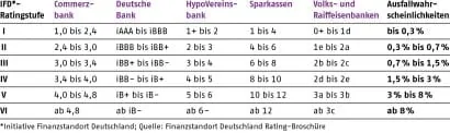 Zahlen, Buchstaben oder die Kombination aus beidem: Die Banken stufen Unternehmer in eine bestimmte Ratingstufe ein je nachdem wie hoch sie die Ausfallwahrscheinlichkeit für den Kredit einschätzen. Wer wie bewertet und welche Güte dahinter steckt, zeigt die Tabelle.