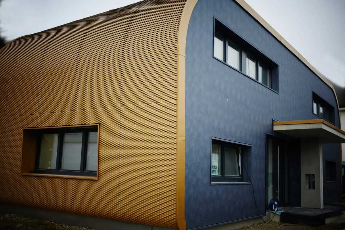 Angefangen hatte alles vor drei Jahren mit dem Obstgarten seiner verstorbenen Großmutter, den Michael Schrodt bebauen wollte: „Ich habe mich einfach hingesetzt und angefangen draufloszuzeichnen. Das war dann auch mein erster Entwurf.“ Danach ging die Ausarbeitung mit der Architektin seines Vertrauens, Susanne Seemüller, weiter. Zusammen mit ihr bekam das Haus mit Aluminiumverkleidung den Feinschliff, wie beispielsweise die runden Kanten.